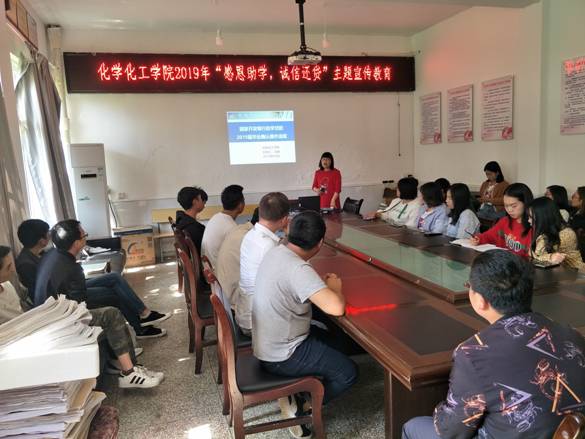 为切实做好化学化工学院2019届毕业生生源地贷款学生的诚信还贷教育工作,帮助贷款学生树立诚信还贷意识,4月11日下午,化学化工学院在我院会议室举办了“感恩助学、诚信还贷”主题宣传教育讲座。该讲座主讲人为辅导员马娟老师,2019届50余名贷款毕业生参加了此次主题教育讲座。