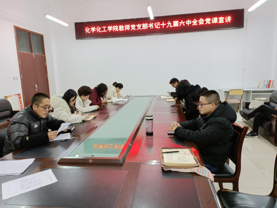 化学化工学院特在2021年12月20日15:00于化学化工学院会议室召开党的十九届六中全会精神专题宣讲活动。本次会议由化学化工学院赵荣飞书记主持并宣讲,化学化工学院教师党员参会。