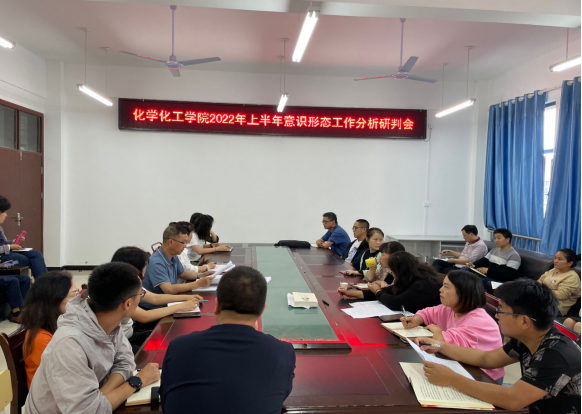 为认真贯彻落实《中共安顺学院委员会意识形态工作责任制实施细则》及中央、省委、市委意识形态工作决策部署和指示精神,认真学习习近平新时代中国特色社会主义思想,进一步加强我院意识形态工作。2022年6月20日下午,安顺学院化学化工学院在会议室召开了“化学化工学院开展2022年上半年意识形态工作分析研判会”,会议由喻辉书记主持。化学化工学院全体教师参加会议。
