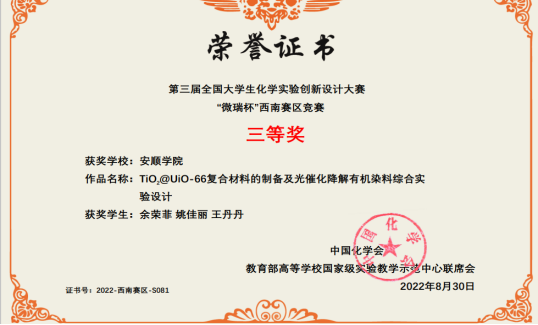 2022年7月19日,第三届全国大学生化学实验创新设计大赛“微瑞杯”西南赛区竞赛复赛在云南大学落下帷幕。化学化工学院共组建三支队伍代表安顺学院参赛,三支队伍均通过初赛进入复赛。经过复赛答辩激烈角逐,由余荣菲、姚佳丽、王丹丹组成的安顺学院一队在张秋云和张玉涛老师指导下荣获三等奖,由赵兴龙、吴苹花、郑红英组成的安顺学院二队在柯杨和赵荣飞老师指导下荣获三等奖,由和梦婷、彭俊豪、兰荣高组成的安顺学院三队在韦复华和任琴会老师的指导下荣获三等奖。