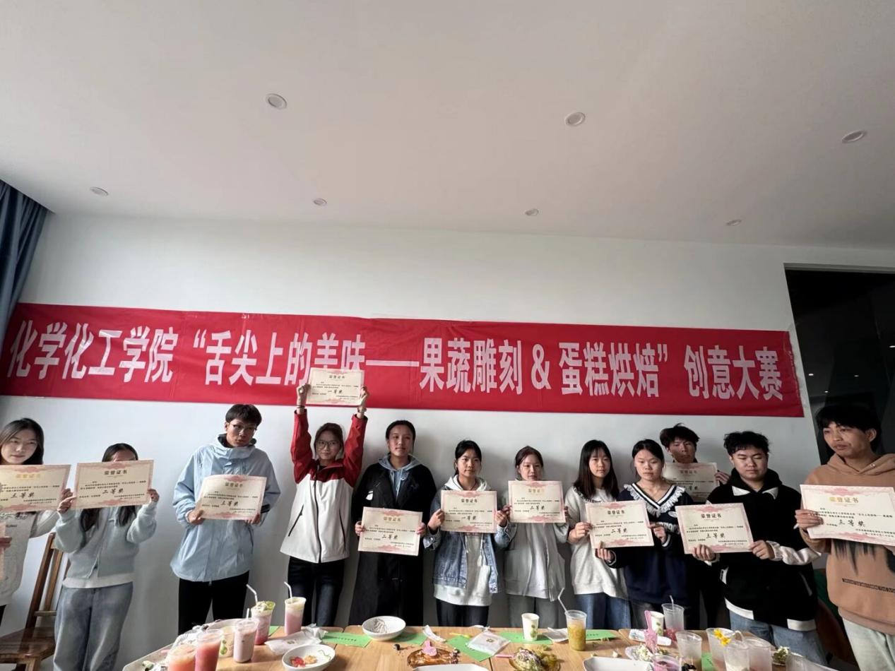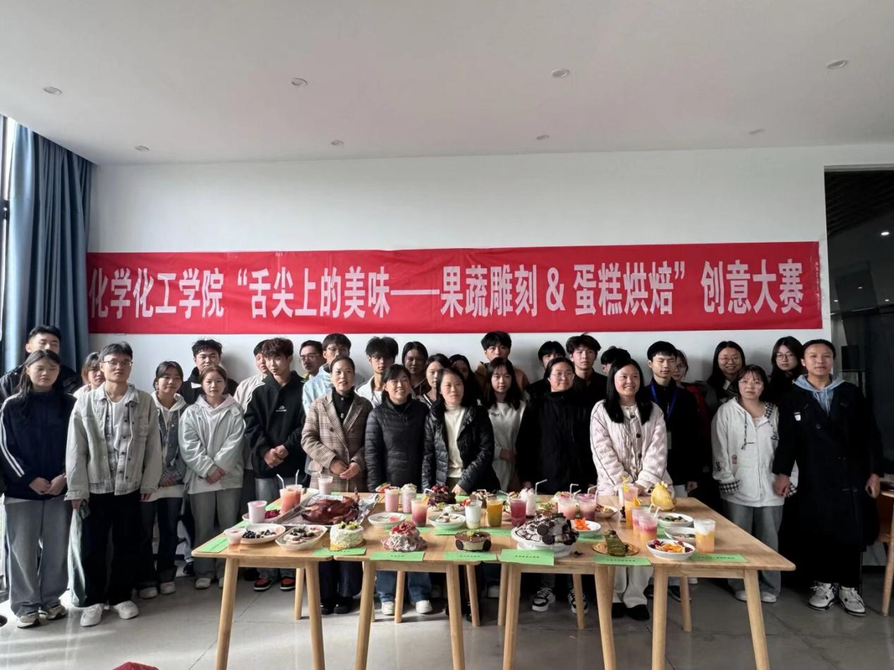 为深入推进“三全育人”、“五育并举”的教育理念,为让实践教育落地生根,进一步增强我院学生的创新意识,提高同学们实践和团结协作能力,促进学生德智体美劳全面发展。10月23日下午,化学化工学院在毓秀一站式学生服务中心共享厨房迎来了一场视觉与味觉的双重盛宴——“舌尖上的美味——果蔬雕刻&蛋糕烘焙”创意大赛,为全院学子提供了一个展示才华、交流技艺的精彩舞台。我院院长张玉涛、办公室主任刘青、教务科金佳幸、郭巧云和靳亚梅、辅导员陈晓淼和马娟出席大赛并现场指导工作。此次活动吸引了来自不同专业的60余名同学踊跃参与,氛围热烈。
