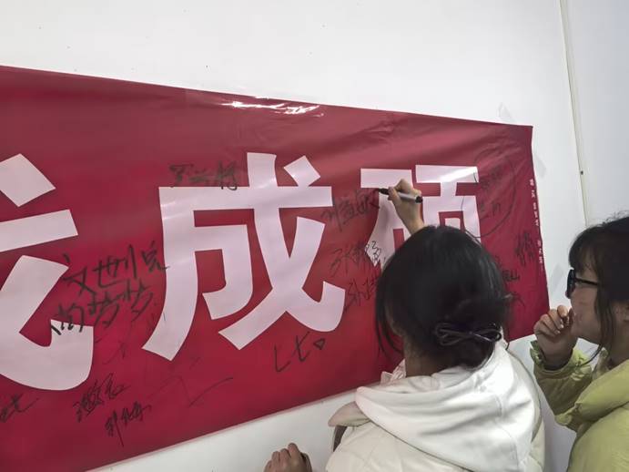 交流环节结束后,2026届考研学子依次上台在“一研为定,一战成硕”的横幅签名板上留下了自己的备考目标与签名,给自己加油打气。