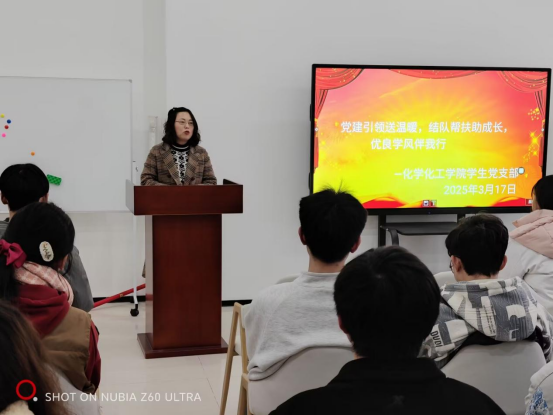 活动伊始,马娟同志强调加强学风建设是化工学院学生工作的重点,我院秉持全心全意为同学服务的宗旨,立足帮扶实际,从学生的个性化需求出发,对帮扶者和被帮扶者进行精准配对,为预警同学搭建起一座互助共进的桥梁。其次,她进一步明确“党员我先行”学业帮扶小组成员的职责并做出要求,即学业帮扶小组成员态度认真负责,认真对待帮扶工作,做到帮扶留痕,对学业预警同学尤其在学业上持续关注关心关爱,并帮助其端正学习态度,让他们体会到老师和同学们的期望和关心。