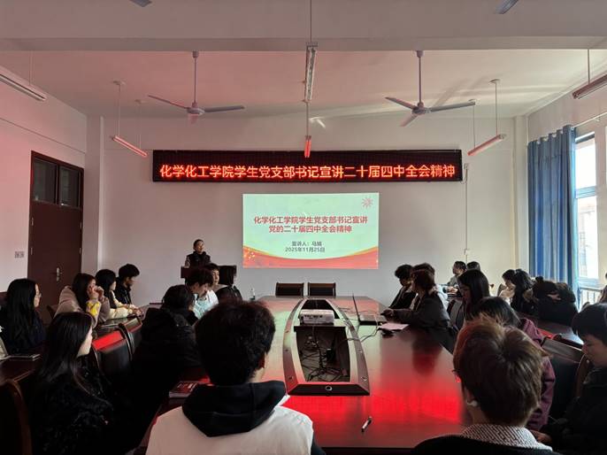 为推动党的二十届四中全会精神在基层组织落地生根、开花结果,11月25日中午,化工学院学生党支部书记马娟同志在顺理楼528会议室为学生支部全体成员作党的二十届四中全会精神宣讲。