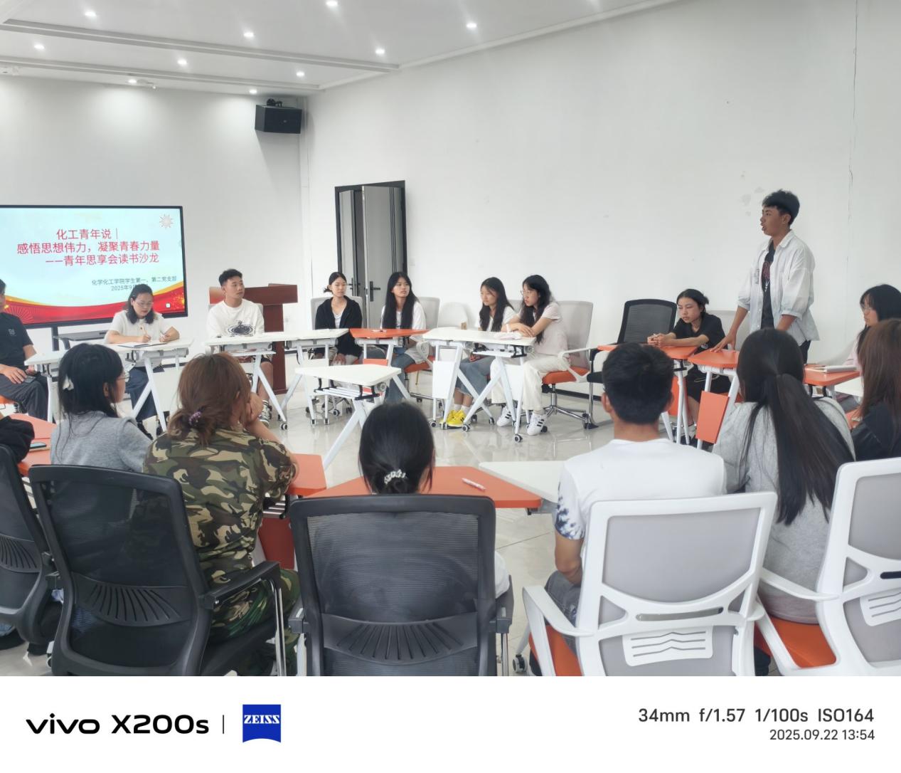 为深入学习贯彻习近平新时代中国特色社会主义思想,进一步强化学生党员的理想信念教育,引导青年党员深刻领悟思想伟力、坚守初心使命,引领入党积极分子们筑牢思想根基,踔厉奋发、勇毅前行,凝聚支部发展的青春力量,激发担当能力,化学化工学院学生党支部于2025年9月22日在毓秀一站式学生服务中心开展了化工青年说——感悟思想伟力,凝聚青春力量“青年思享会”读书沙龙活动。支部学生党员和积极分子参加,学生支部书记马娟同志主持。