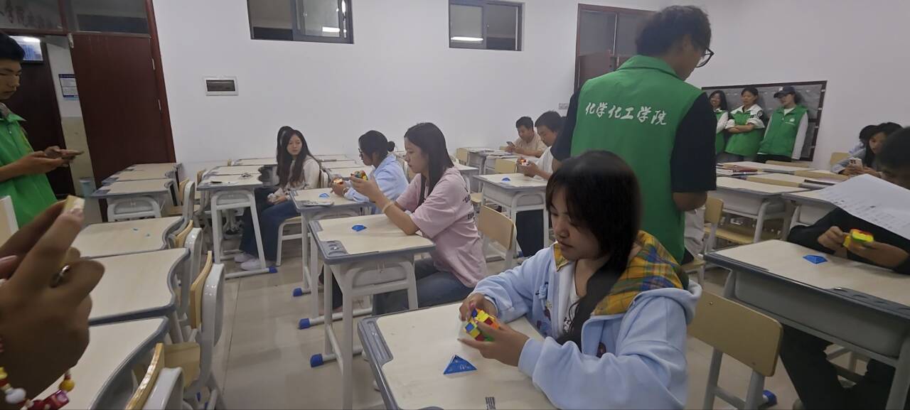 紧接着,魔方比赛区域也热闹起来。同学们围坐在一起,手里拿着打乱的魔方,全神贯注地转动着。没有相互的竞争,只有对速度的自我挑战和对技巧的交流。每当有人率先完成,大家都会不约而同地报以掌声,分享这份成功的喜悦。