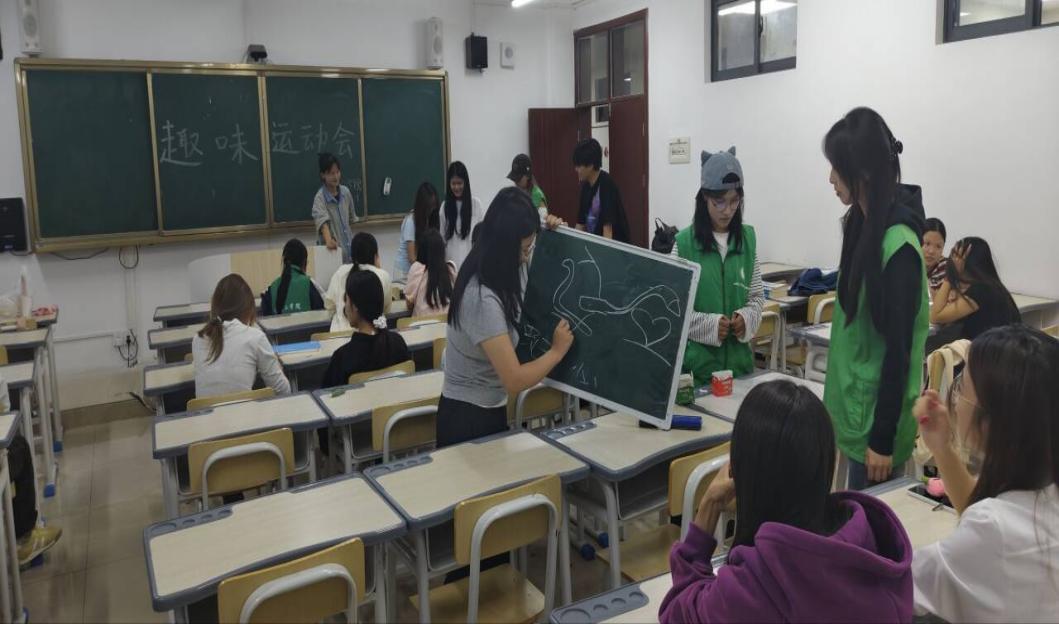 10月11日,“你画我猜”的比赛也开始了。五人一组的同学们围站在画板旁,分工明确。负责画画的同学手忙脚乱又创意十足,猜词的队友们则急得抓耳挠腮,时不时爆出可爱的错误答案。整个过程笑声不断,完全没有比赛的紧张感,更像是一场充满乐趣的集体游戏。