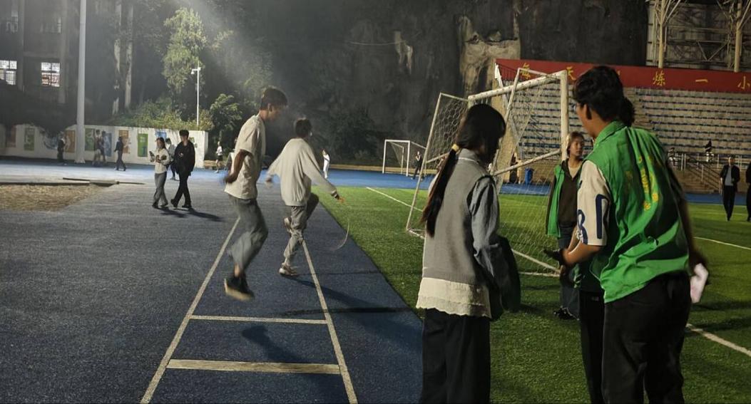 最后是跳绳比赛区域,男生女生一分钟单摇,场面十分热闹。绳子在空中划出一道道优美的弧线,选手们轻盈的身影随着节奏跳跃,脸上洋溢着自信的笑容。旁边的同学自发地为他们数数、加油,每一个数字的增长,都伴随着一阵欢呼,整个赛场充满了青春的活力。