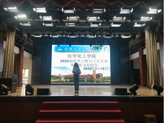 2022031 8午,化学化工学院在学校礼堂举行了2022届毕业实习总结大会。化学化工学院院长杨莉莉、书记喻辉、学院参加实习工作的赵荣飞老师、曹彬老师、王胜碧老师、李文秀老师、任琴会老师等,2022化学班化学工程与工艺班、食品质量与安全班全体学生参加了此次总结大会。会议由赵荣飞老师主持。