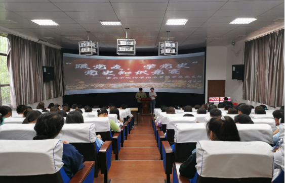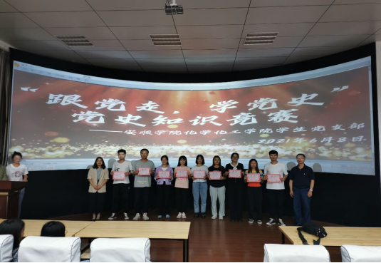 为迎接中国共产党百年华诞,2021年6月28日中午,化学化工学院学生党支部在旅游实训室A02教室开展了主题“跟党走、学党史”党史知识竞赛。本次比赛由文勇武和金果果主持。由学生支部部分学生党员、预备党员为评委,本次党史知识竞赛由学生支部积极分子、发展对象及党员同志们组成的九支代表队。