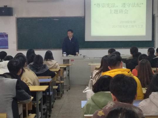 2019年12月6日16:00,2019级化学专业、2017级化学工程与工艺专业两个班的学生在新教学楼召开“尊崇宪法 遵守法纪”主题班会,参加此次班会的有2019级化学专业班级导师、校党委副书记陶文彩教授,化学化工学院党委书记杨莉莉副教授,2019级化学专业、2017级化学工程与工艺专业班主任韦复华副教授及两个专业全体同学。