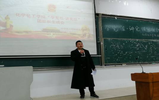 2018年12月11日晚19:00,化学化工学院“学宪法·讲宪法”团组织生活会活动在新教A12举行,此次活动,特邀了化学化工学院团总支学生书记娄国平、化学化工学院团总支学生会副主席陈友岚为团员们作指导。参与本次团组织生活会的成员有2017级、2018级化学团支部、2017级、2018级食品质量与安全团支部、2017级、2018级化学工程与工艺团支部等共计6个团支部392名同学出席。担任本次活动主持人的是化学化工学院团总支学生会组织部部长邰世明及部员贺飞。