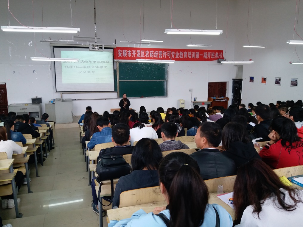 2018年3月20日中午,安顺学院化学化工学院的全体学生在A12教室召开了安全教育大会,张来院长、杨莉莉书记、辅导员、班主任老师及化学化工学院全体学生参加了此次大会。
