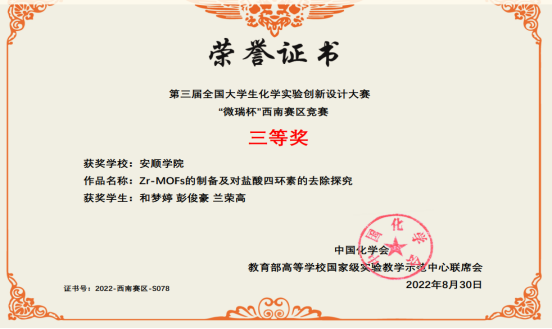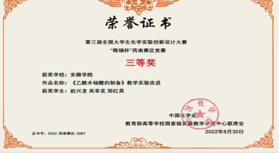 2022年7月19日,第三届全国大学生化学实验创新设计大赛“微瑞杯”西南赛区竞赛复赛在云南大学落下帷幕。化学化工学院共组建三支队伍代表安顺学院参赛,三支队伍均通过初赛进入复赛。经过复赛答辩激烈角逐,由余荣菲、姚佳丽、王丹丹组成的安顺学院一队在张秋云和张玉涛老师指导下荣获三等奖,由赵兴龙、吴苹花、郑红英组成的安顺学院二队在柯杨和赵荣飞老师指导下荣获三等奖,由和梦婷、彭俊豪、兰荣高组成的安顺学院三队在韦复华和任琴会老师的指导下荣获三等奖。