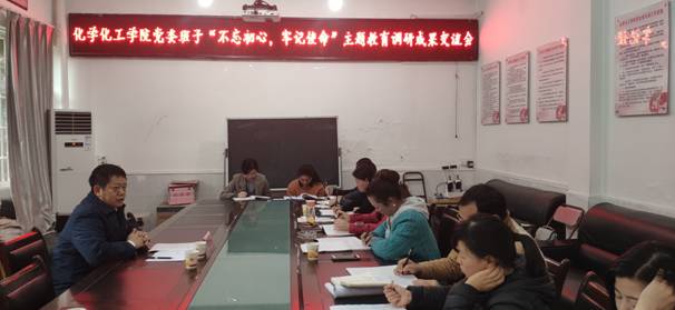 2019年11月5日下午,我院开展党委班子“不忘初心,牢记使命”主题教育调研成果交流会,安顺学院党委副书记陶文彩,化学化工学院党委书记杨莉莉,院长施渺筱,副院长张红霞、赵荣飞参加,化工学院部分党员教师共14人参加,会议由化学化工院党委书记杨莉莉同志主持。