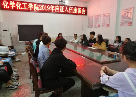 为积极响应国家征号召,鼓励大学生参军入伍,2019年9月11日,化学化工学院在会议室召开了征兵入伍座谈会,欢送3位应征入伍同学。化学化工学院党委书记杨莉莉老师,辅导员老师,班主任,部分班级学生参加了此次座谈会。