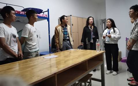 在走访过程中,杨书记对新生们进行慰问、了解新生们的状况、对同学们给予关心,让刚离开家,离开亲人的同学在学校感受到丝丝的温暖。化学专业班主任韦复华老师让同学们在任何方面都要严格要求自己,不要松懈,努力学习,要做好吃苦的准备。食品质量与安全专业班主任汪婷老师,对新生到寝人数进行清点,并且殷切嘱咐同学们在今后的大学生活中团结互助,共同进步。化学工程与工艺专业班主任秦兰老师在走访宿舍过程中,对宿舍的相关制度进行了讲解,帮助同学们解决困难,并且强调一定保管好自己的财务,不要进行网贷。班助们建议同学们,在学习生活中积极表达自己的想法,多参加校内外活动,遇到困难要及时向老师反馈。