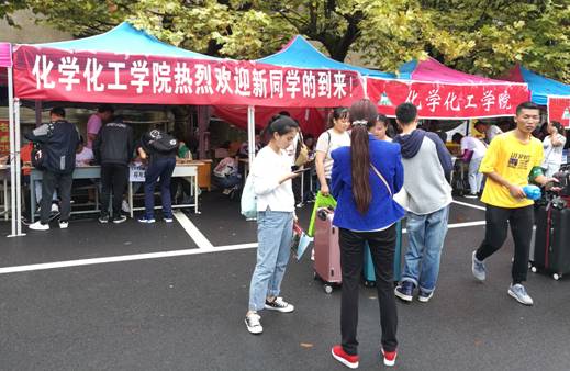 在丹桂飘香的金秋,伴着雨水的奏乐,2019年9月9日化学化工学院迎来了2019级的新生。虽然下着淅淅沥沥的小雨,但这并没有打消大家的工作积极性,我院迎新志愿者、学生会全体成员、以及各班的班主任和班助早上7点半就来到迎新现场。志愿者们延续往年“一对一”服务的方式,每一个迎新工作点都有化学化工学院志愿者的身影。有的帮新生领宿舍钥匙、有的带领新生前往宿舍安置行李,有的引导新生前往计财处进行缴费。尽管迎新志愿者的鞋子被雨水打湿,裤子被浸湿,却没有一个人说抱怨的话,都在工作岗位上兢兢业业。他们不停的穿梭于人群中用他们最独特的方式做着最美的自己,用最美的一面呈现“绿色迎新”的化学化工学院。大家都把自己的微笑带给了每一位新生,用积极向上的态度为新生们打造了一个和谐、团结的化学化工学院。