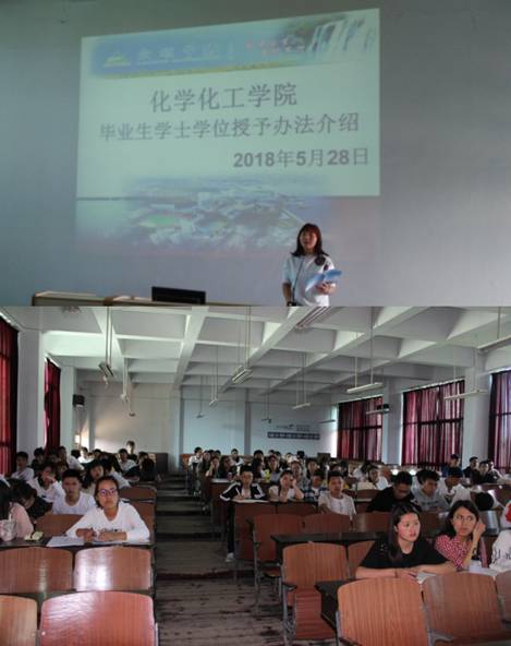 2018年5月28日,化学化工学院在电教楼五楼多媒体教室召开了2019届毕业生学业审查预警会。化学化工学院教务科科长杨玉萍老师、2019届毕业班班主任老师及2019届全体学生参加了此次大会。会上,杨玉萍科长向同学详细解读了《安顺学院学生毕业资格审核办法》《安顺学院学士学位授予管理办法》的相关规定;并结合自己的工作实际给同学们介绍了近年来一些拿不到毕业证和学位证的典型案例;然后对同学们提出了要求,一是要求学生登录教务系统查阅自己的课程成绩、特别是公选课获得学分情况;二是了解自己所有课程平均分在班级的排名情况并判断自己获得毕业证书和学位证书的可能程度,如果发现有问题要按文件所列方案,积极做出补救措施;三是抓住最后一年的机会,争取在今后的课程、实践及论文等教育教学环节取得良好成绩;最后祝愿所有同学都能顺利能取得毕业证书和学位证书。(化工杨玉萍)