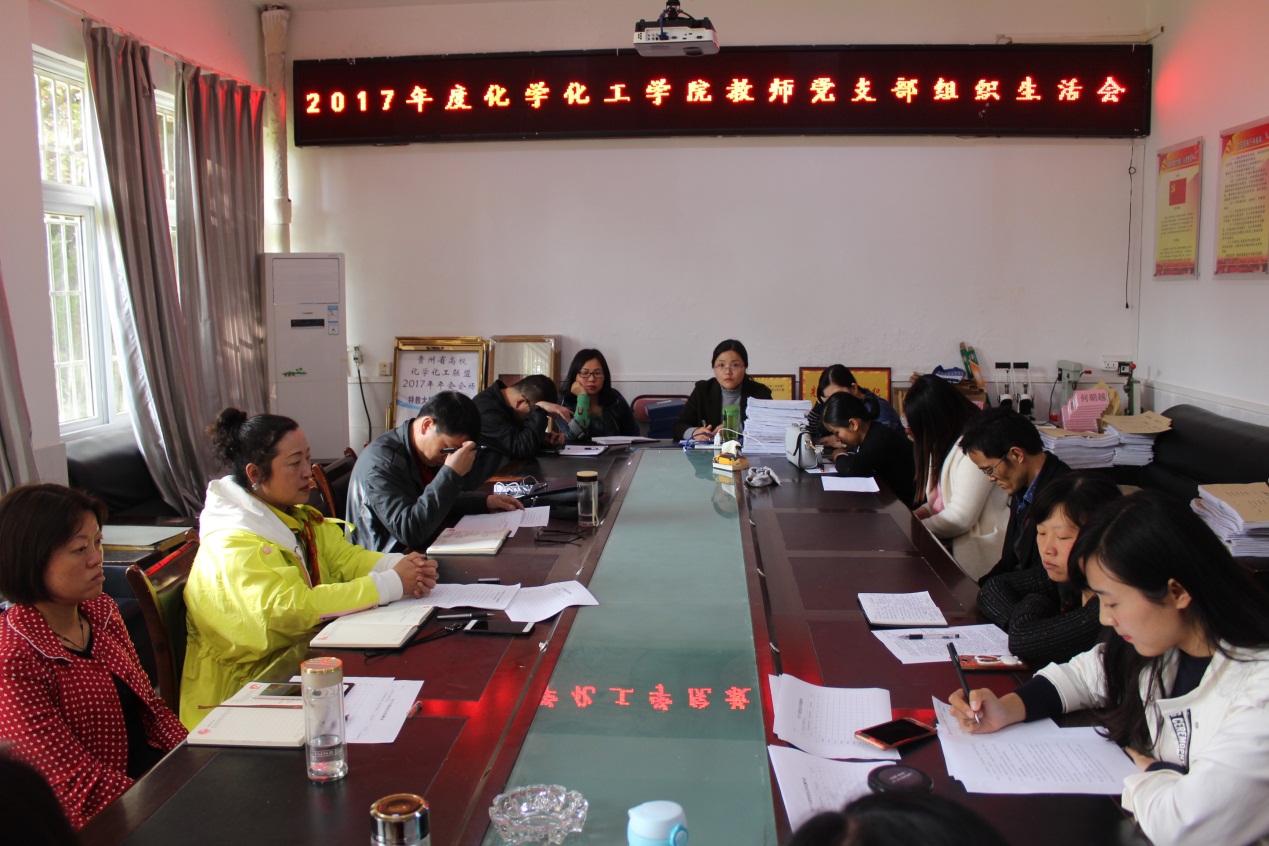 根据《关于召开2017年度基层党组织组织生活会和开展民主评议党员工作的通知》(安组通〔2018〕6号)精神,化学化工学院各党支部于3月28日召开组织生活会和开展民主评议党员工作。学院党总支书记杨莉莉,党总支委员、院长张来,党总支委员、副院长张红霞,教师支部和学生支部全体党员分别参加了所属支部组织生活会和民主评议党员工作。