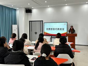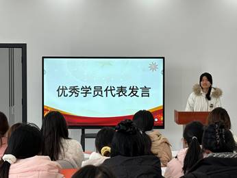 首先,马娟对学员们顺利完成本期党课学习表示祝贺,她勉励大家要将党课所学转化为实际行动,在今后的学习、工作和生活中,坚定理想信念,以更高的标准严格要求自己,不断提升自身素质,积极发挥先锋模范作用,努力向党组织靠拢,为党的事业贡献自己的青春力量。其次,在热烈的掌声中,学员代表依次上台领取了结业证书。这一纸证书,不仅是对学员们一段时间以来认真学习、深入思考的肯定,更是对他们继续追求进步、向党组织靠拢的鞭策与期望紧接着。随后,优秀学员代表同学发言。两位优秀学员回顾了此次党课培训期间的收获与成长,表达了对党组织培养的感激之情,并郑重承诺将以此次培训为新的起点,在今后的学习、工作和生活中以党员标准严格要求自己,发挥模范带头作用,积极接受组织考验,争取早日成为一名光荣的中国共产党党员。