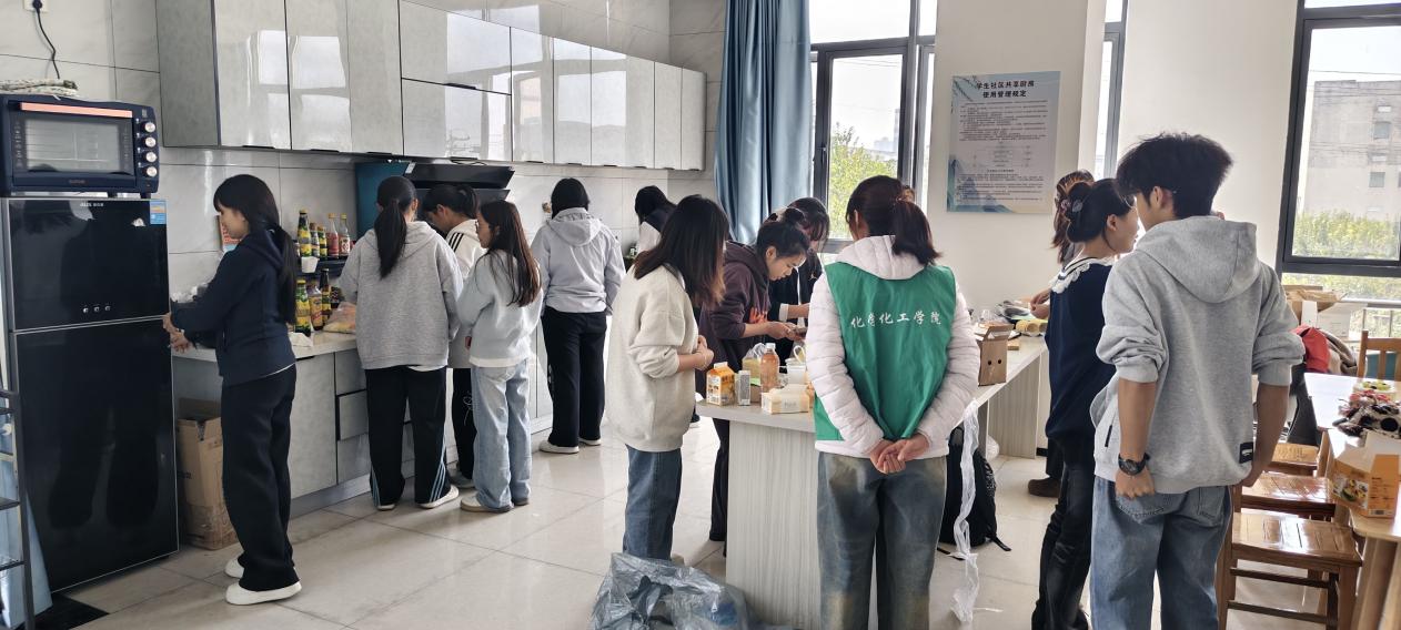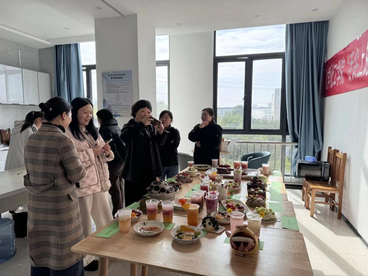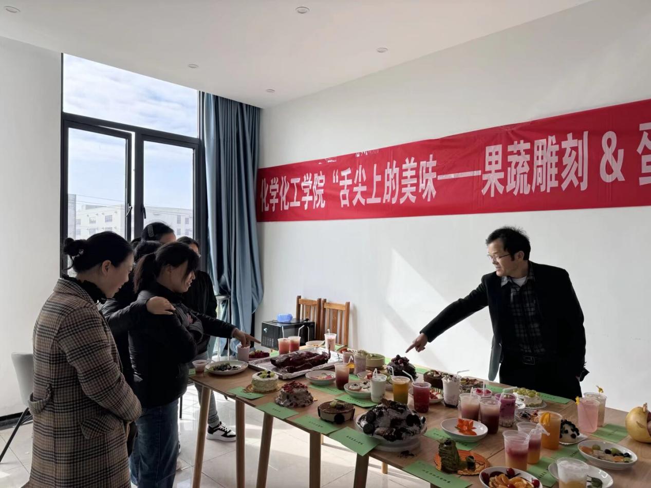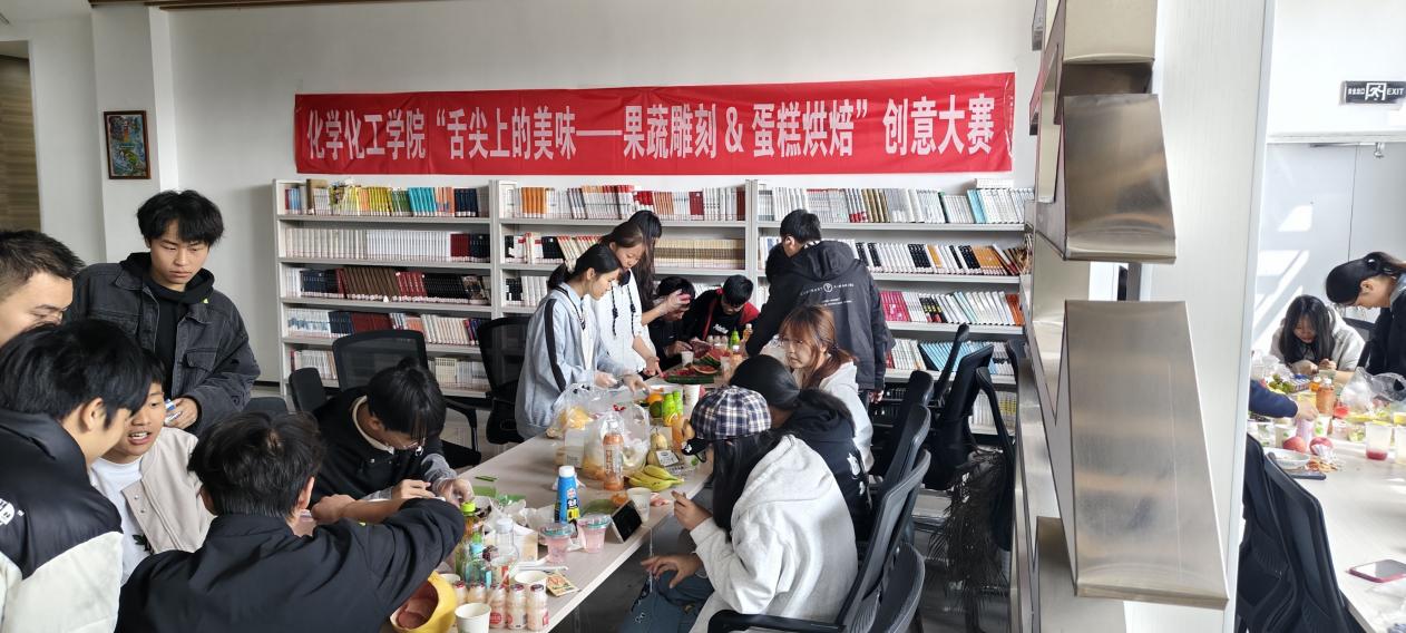 为深入推进“三全育人”、“五育并举”的教育理念,为让实践教育落地生根,进一步增强我院学生的创新意识,提高同学们实践和团结协作能力,促进学生德智体美劳全面发展。10月23日下午,化学化工学院在毓秀一站式学生服务中心共享厨房迎来了一场视觉与味觉的双重盛宴——“舌尖上的美味——果蔬雕刻&蛋糕烘焙”创意大赛,为全院学子提供了一个展示才华、交流技艺的精彩舞台。我院院长张玉涛、办公室主任刘青、教务科金佳幸、郭巧云和靳亚梅、辅导员陈晓淼和马娟出席大赛并现场指导工作。此次活动吸引了来自不同专业的60余名同学踊跃参与,氛围热烈。