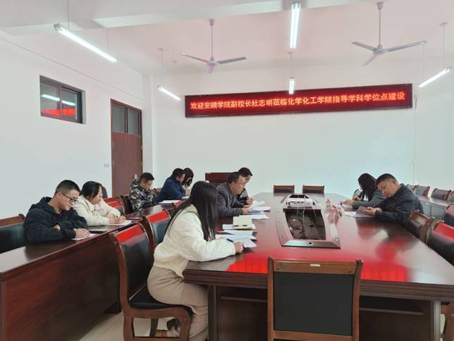 2025年12月8日下午,安顺学院副校长杜志明同志莅临化学化工学院调研并指导学科建设与申硕工作。调研会上,化学化工学院陈红亮副院长就学院当前的学科方向、师资队伍、科研平台、标志性成果及人才培养质量等情况做了汇报,并说明了下一步拟建设学位点基本情况、短板与对策。